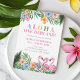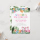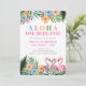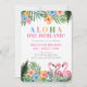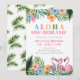 Convite de 1º Aniversário Aloha Onederland Summer Tropical Girl apresenta um design tropical vibrante com folhas verdes exuberantes, flamingos rosa e flores coloridas em um fundo branco. O título divertido "ALOHA ONE-DERLAND!" define o tom alegre, com espaço para nome personalizado e detalhes da festa.