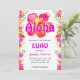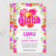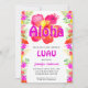 Possui flores tropicais brilhantes de hibisco e personalizadas com suas informações. Uma maneira divertida de convidar convidados para o seu dia especial! Design ©Rosalind Moore, Design de Cherry Lane.