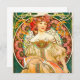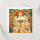 Cartão com o registro litográfico de Alphonse Mucha (1897). O retrato de uma mulher de vestido branco lê um livro, sentado diante de flores cor-de-rosa e laranja. Um presente de excelente para fãs de Arte Nouveau e de Arte Boêmia.