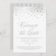Mude a data! Anuncie à sua família e amigos seu adiamento de casamento com este elegante cartão de anúncio de casamento. Ele apresenta pontos falsos de configuração de folha prateada com padrão de listras. Personalize adicionando seus nomes e outros detalhes. Este cartão de adiamento do casamento da folha prateada também será perfeito como um anúncio de elopeamento.