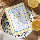 Chá de panela amarelo-branco azul-azul-azul-azul-azul-azul doce ciao bella chá de panela desenhado à mão com um quadro azul-quirky sobre um fundo listrado amarelo. Este chá de panela branco apresenta também algumas ilustrações de vidro, garrafa, azeitona e limões desenhados à mão.