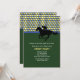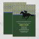 Um convite esportivo perfeito para uma festa do Kentucky Derby ou qualquer ocasião relacionada a corridas de cavalos. O cartão apresenta um padrão de estilo amarelo, branco e azul no topo, um fundo verde sólido e um jóquei em silhueta sobre um cavalo a preto.O convite é fácil de personalizar com seu texto, fonte, cor da fonte e escolha de seis tipos de papel.
