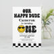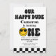 Black White Yellow Our Happy Dude primeiro aniversario Convite Simples e doce, primeiro aniversario de cara feliz convite para um bebê rapaz com rosto amarelo e óculos pretos, texto retrô estilo e padrão preto e branco de tabuleiro.