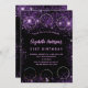 Um convite de aniversário feminino e feminino de 21 ruas (ou qualquer idade). Na frente: Um fundo preto chic. Decorado com pó brilhante púrpura escura. Personalize e adicione um nome, detalhes da festa e 6 fotos. O nome é escrito com um script de estilo manuscrito, letras claras e roxas. Fundo: fundo preto e brilho sujo.