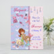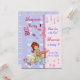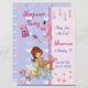 Padrão festivo de corações bonitos em azul claro/lilás. Há toques doces e femininos com laços rosa impressos e acabamento em renda. Três meninas estão usando pijamas e prontas para a festa. Personalize o texto na frente e no verso deste convite de aniversário de uma festa do pijama adorável. Nome, ano de aniversário e todas as informações estão prontas para serem alteradas por você.