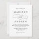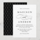 Convite de casamento simples, clássico, preto e branco com "e" em uma letra elegante que é perfeita para casamentos em qualquer época do ano. O reverso do convite de casamento apresenta um design de padrão vinculado tradicional. Personalize os convites de casamento de na moda com seus detalhes de casamento personalizados!