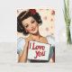 Uma ilustração vibrante no estilo pino-up clássico dos anos 1950. A imagem apresenta uma mulher glamourosa com curvas vintages, maquiagem ousada e um sorriso radiante. Ela segura uma placa com uma mensagem amorosa, "Eu te amo", colocada contra um pano de fundo de delicadas rosas rosa. A estética geral captura a vibração romântica e brincalhona da arte "pin-up" do século do médio.