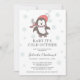 Pinguim bonitinho de inverno com flocos de neve convidando chá de fraldas em um estilo neutro com gênero, com o ditado: bebê é frio lá fora.