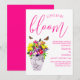 O amor está florescendo! Coleção de casamentos florais vibrantes com um buquê num vaso de mármore rodeado por borboletas e acompanhado por tipografia de guião fuchsia.