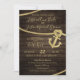 Dourada Âncora e navio castanho escuro madeira colo com tema "amarre o nó" convite náutico para o seu cruzeiro, ou núpcias de praia de destino. Douradas cordas de amarração através deste convite com uma âncora em negrito colocada ao lado. Uma combinação de escrita manual e fontes antigas em inglês adiciona ao encanto deste convite de casamento náutico único.
