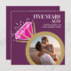 Convide amigos e familiares para uma festa especial de cinco anos de casamento ou celebração de jantar com esses tons dourado, rosa, vinho tinto escuro e branco. Gráficos de um anel de eternidade de ouro e turmalina rosa e duas fotos do então e do agora no centro dos convites de aniversário de 5 anos com o tema de anéis. Personalizado com suas próprias fotos do dia do casamento do casal e uma foto atual no verso, e adicione suas próprias palavras de celebração, data da festa e local. Outros itens correspondentes estão disponíveis. Arte e design gráfico original do anel por www.mylittleeden.com na Zazzle.