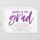Convide convidados para a sua festa de formatura com o nosso na moda e Trendy Cheers para os convites para a festa de formatura de Formando! Os convites da festa de formatura moderna contêm a frase "Saúde ao formando" em um roteiro de pincel roxo, com letras manuais, com os detalhes de sua festa mostrados abaixo. Os convites de festa de formatura revertem para um padrão abstrato de ponto roxo e branco. Perfeito para festas segundos graus e formandos!