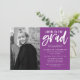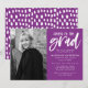 Convide convidados para comemorar o formando com nossos Cheers para os convites de festas de formatura de Formando. Os convites para a festa de formatura moderna apresentam a foto vertical do formando à esquerda. "Saúde ao formando" é exibido em um script de pincel branco, com letras de mão, com um fundo roxo. Personalize a frente do convite adicionando o nome do formando, o nome da escola, o ano de graduação e os detalhes da festa. O convite reverte para exibir um padrão abstrato roxo e branco de ponto.