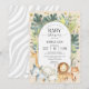 Convite de chá de bebê moderno e fofo neutro para bebês meninos e meninas. Apresenta floresta da selva em aquarela e animais bebês de safari com fundo bege. As esquemas de cores deste convite de chá de bebê podem ser usados para dar as boas-vindas a um bebê menino ou menina em todas as estações.