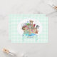 A Arca de Noé cheia de animais com faixa aqua que diz "Bebê a caminho!" em um fundo xadrez verde menta. O verso é uma cegonha carregando um buquê menta. Perfeito para Chás de Bebê, Anúncio de Bebê, Crisma ou Batismo.