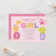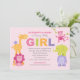 Este convite colorido de chuvada de bebê apresenta uma pilha divertida de amigos animais da selva — leão, girafa, macaco, elefante e hipopótamo — ao redor do texto em negrito "MENINA" em cores vibrantes de arco-íris. Projetado para casais que hospedam juntos, o layout da redação inclui espaço para os nomes dos pais. Um fundo de bolinhas rosa coordena com o design de dois lados. Toda a redação é totalmente personalizável para sua celebração.