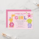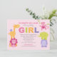 Este convite colorido para chá de bebê apresenta uma pilha divertida de amigos animais da selva — leão, girafa, macaco, elefante e hipopótamo — ao redor do texto em negrito "GIRL" em cores vibrantes de arco-íris. O tema divertido de safári é perfeito para a celebração de uma menina, com sotaques rosa, laranja, verde, roxo e cinza por toda parte. Um fundo de bolinhas rosa coordena e completa o design dos dois lados. Todas as palavras são totalmente personalizáveis para o seu evento.