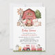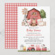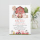Convide amigos e familiares com estilo e defina o tom do seu dia especial com este encantador convite de chá de bebê. O design apresenta animais da fazenda (vaca, cavalo, ovelha, porco, galo, galinha), celeiro vermelho e trator vermelho em fundo branco.