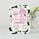 Convite para o aniversário do tema fazenda com vaca, ovelha, cabra e porco sobre impressão de cochicho, gingham rosa cheque design sobre fundo do quadro.