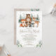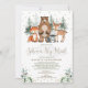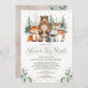 Convite de "chá de fraldas por correio" em madeira branca, com ilustração adorável de aquarela de quatro amigos da floresta: raposa, veado, urso e guaxinim