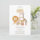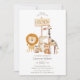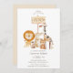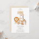 Este convite personalizado apresenta um tema de zoológico de festa de aniversário. Uma imagem de vários animais do zoológico bebê é feita em pé perto de um cartaz de madeira. Entre os animais está um leão bebê, um limor, um crocodilo, um filhote de tigre bebê, e uma girafa.