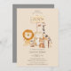 Este convite personalizado apresenta um tema de festa de aniversário de zoológico em um fundo bege. Uma imagem de vários bebês animais do zoológico está em pé perto de uma placa de madeira. Entre os animais estão um leão bebê, um lêmure, um crocodilo, um filhote de tigre e uma girafa.