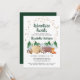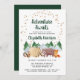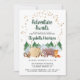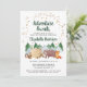 O doce convite para bebês rústicos, com ilustrações bonitinhas de animais da floresta com sua tenda acampando nas montanhas e na floresta, uma camada de estrelas de ouro e "Aventura Aguarda" e o nome da futura mãe em um roteiro verde de caça escuro. Personalize facilmente os detalhes do chá de aspersão para bebês.