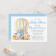 Moderno Elegante Aquarela Animais Bebês Ar Quente Convite Para Chá de fraldas De Balões De Ar Quente. Os bebês incluem elefante com Arco azul, macaco, girafa, rinoceronte, zebra e leão. Texto Prateado e Azul.
