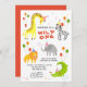 Animais Safari Selvagens de Um primeiro aniversario Curta Crianças Convites Contém girafa branca, elefante, leão, zebra e crocodilo, animais selvagens bonitos e coloridos com o texto "Wild One" em um roteiro de tipografia laranja moderno, acentuado com o número 1, balões e confete. Perfeito para meninos ou filhotes da primeira festa de aniversário. Envie o e-mail ou simplesmente faça o download do e-convite digital compartilhável para download. Elaborado por ©Evco Studio. Para obter informações sobre a coordenação de itens, consulte www.zazzle.com/store/evcostudio
