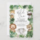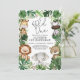 Celebre o primeiro aniversario do seu filho com este convite de festas de safari caprichoso. O design apresenta um grupo de adoráveis animais da selva e um exuberante verde aquícola tropical