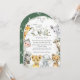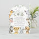 Convide amigos e família de estilo e dê o tom para seu dia especial com este charmoso convite para chás de fraldas. A design apresenta os animais da selva (girafa, macaco, zebra, leão, elefante, chita, meerkat, rinoceronte) e as folhas de eucalipto em fundo branco.