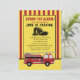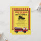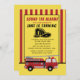 Convite de aniversário de caminhão de bombeiros para uma criança que completou 4 anos, ou qualquer idade. Todo texto é personalizável. Um caminhão de bombeiros se senta sobre um fundo listrado vermelho e branco. Textos dizem: "Soem o alarme!" Personalizado com o nome, a idade e as informações da festa do seu filho. Entre em contato comigo para obter assistência com sua personalização ou para solicitar produtos adicionais de correspondência ou coordenação para o seu partido.