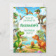 Um convite de aniversário de dinossauro bonito e colorido é perfeito para uma comemoração pequena. O lado frontal contém o convite e o seu nome especial. O verso inclui todos os detalhes pertinentes, incluindo a data, a hora, a localização e as informações sobre o rsvp. O texto é completamente personalizável. Este convite inclui pterdactyl, brontosaurus, t-rex e triceratops. Este design apresenta conteúdo generativo.