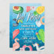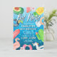 Quem não ama uma festa de piscina de verão! Esta design é divertida, colorida e na moda com a água azul aqua cristalina escutando ao sol do verão, uma variedade de insumos de novidade de tendências e uma modelo de festa de aniversário legal que pode ser personalizada usando a modelo fornecida.