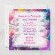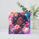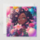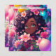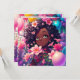 Bonito convite personalizado de aniversariante. Gráficos bonitos de uma linda moça de anime afro-americana com flores rosa bonito em seu lindo cabelo encaracolado. Estas são bonitas para uma adolescente ou pré-adolescente. As cores são cor-de-rosa, roxa, azul e amarela.