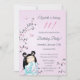 Uma boneca de kokeshi fofa num kimono de turquesa rosa-pia debaixo de uma árvore de cherryblossom rosa. Com um texto personalizado em uma fonte elegante para as festas de aniversário femininas.
