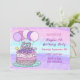 O bolo de aniversário desenhado por mão branca roxa e rosa e balões e convites de festas de aniversários femininos.