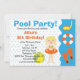 Este convite de aniversário de piscina de verão apresenta uma menina com cabelo loiro cercado por seus brinquedos de piscina, incluindo um tubo interno, uma bola de praia, pantufas e uma máscara de natação. Completamente personalizável.