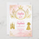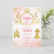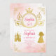 Modelo de convite para o aniversário da princesa do rosa e do ouro. Coroa cor-de-fundo rosa, princesa, castelo princesa, cores quentes e bonitas para uma menina.