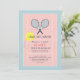 Este belo convite de aniversário da "Game, set, match!" da menina apresenta um par de raquetes, uma bola no fundo do tênis em rosa e azul. O verso apresenta um fundo azul marinho com bolinhas brancas. Personalize para suas necessidades. Você pode encontrar mais produtos correspondentes na minha loja.