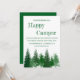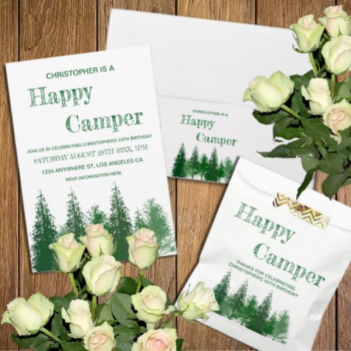 Feliz aniversário de camper com árvores florestais em vários tons de verde