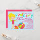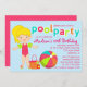 Moderno e brilhante, este convite apresenta uma menina loira vestindo um maiô rosa quente e um braço de verde limão flutuando. uma bolsa de praia e uma bola. Cores vibrantes para um convite de festas de piscina feminino. Alguns elementos de Jessica Weible @ Mygrafico.com