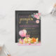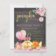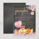 Convites de aniversário de menina pequena abóbora com lindas balões e abóboras cor-de-rosa e laranja e douradas em um fundo de quadro negro com texto cor-de-rosa e dourado. Você pode personalizar facilmente este convite de aniversário de abóbora pequena adorável para o seu evento, simplesmente adicionando seus detalhes. Este é um design impresso sem folha real, laços, etc.