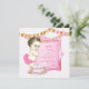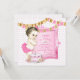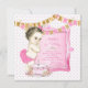 Fundo de pérola rosa com faixas rosa e dourado e convites de aniversário de primeira idade de menina vintage adoráveis. Este convite de aniversário de primeira idade rosa é facilmente personalizado para o seu evento, adicionando seus detalhes no estilo de fonte e cor, texto e layout de sua escolha.