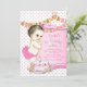 Convites de festa de primeiro aniversário de menina com lindo fundo de pérola rosa com faixas rosa e dourado e adorável menina vintage e bolo de aniversário. Este adorável convite de primeiro aniversário rosa é facilmente personalizado para o seu evento, adicionando seus detalhes no estilo de letra e cor, texto e layout de sua escolha.