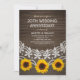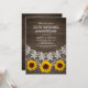 Convites de Aniversário de 20 anos de Casamento Rustic Wood Country com Renda e Girassóis. Personalizados para os detalhes da sua celebração. Você pode alterá-lo para aniversários de 10, 30, 40, 50, 60 anos etc. Caracteriza renda linda, girassóis e tipografia em um fundo de madeira escura rústica. Ótimos convites de aniversário de casamento elegantes para aniversários country criativos. Este convite de aniversário de casamento foi projetado por superdazzle.com