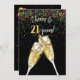 Brinde de champanhe em preto com confete colorido para convite para aniversário de 21 anos.