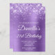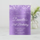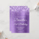 Crie seu próprio convite para comemoração de aniversário de 21 anos de na moda para sua filha. Gráficos brilhantes e roxos de luz brilhante decorativos formam uma borda superior. A arte digital em segundo plano apresenta uma lavanda brilhante, estilo ombre roxo, com papel de metal escovado. Personalize a cor do texto branco do convite ou os estilos de fonte. O texto do evento também é personalizável para corresponder ao seu aniversário especial de etapa. Os faíscas, brilho e folha de luxo serão criados por elementos artísticos que impressão gostam de uma foto.