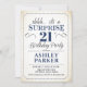 Convite de festas de aniversário de 21 anos surpresa. Design de classe simples em branco, marinho azul e preto. Apresenta uma fonte elegante de script. Celebração surpresa para homem ou mulher. Pode ser personalizado em qualquer idade!