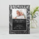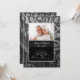Convite elegante de aniversário de casamento de vinte e cinco anos em damasco floral preto e prata com borda de acento prateado para celebrar aquela data especial de vinte e cinco anos juntos. Envie uma foto para substituir o espaço reservado para a foto. Personalize o texto da frente e do verso do convite com a hora, data, local e outras informações.
